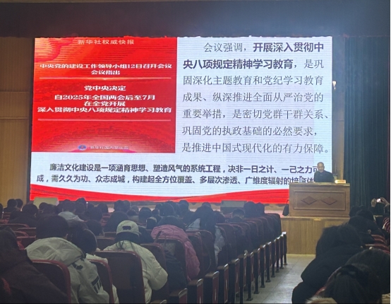 校纪委强调四点要求:一是强化理论武装、筑牢思想根基,持续深入学习习近平总书记关于全面从严治党的重要论述,牢记中央八项规定精神具体要求,将学习教育内化于心、外化于行;二是严守纪律底线、规范权力运行,加强重点领域和关键环节监督,健全内控机制,防范廉政风险;三是丰富廉洁文化建设载体,通过主题教育活动推动廉洁文化融入;四是压实主体责任、推动标本兼治,学校各级党组织、党员领导干部要以此次党课为契机,时刻绷紧廉洁自律这根弦,强化廉洁自律意识,以忠诚干净担当的实际行动,共同营造风清气正的校园政治生态。